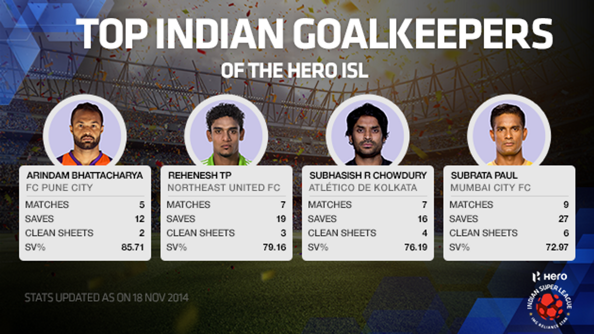 1. Arindam Bhattacharya (FC Pune City): FC Pune City’s Arindam Bhattacharya leads the list with a save percentage of 85.71. Incidentally, his SV% is the highest, not only amongst the Indian goalkeepers but even amongst the internationals. Arindam has played five games for Pune, and has kept two clean sheets. He has let in only 3 goals out of the 18 shots he was up against, one being a penalty kick. Arindam also leads the chart for the Golden Glove award. Arindam won his way into the starting line-up after Italian Emanuele Belardi was injured, but has held onto his place even after Belardi has returned to full fitness. Belardi conceded 6 goals in four matches - though 5 of these came in one match, against Mumbai City.