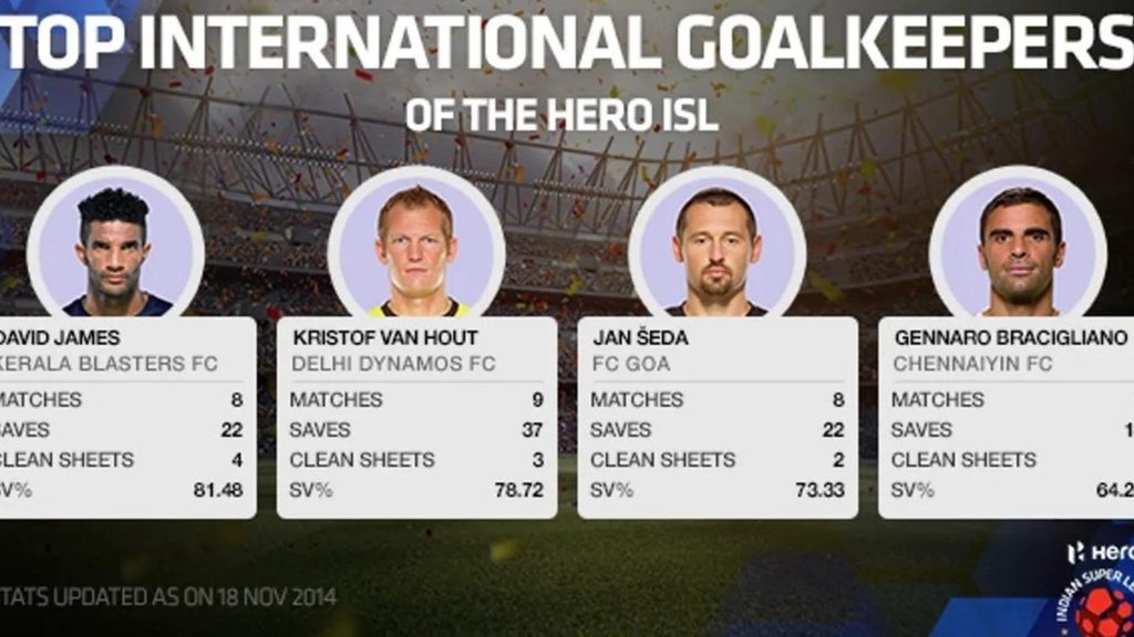 1. David James (Kerala Blasters FC): The England international who has represented an array of clubs in the English Premier League, perhaps unsurprisingly tops the international goalkeepers list. With a SV% of 81.48, Kerala’s marquee player and coach is second in contention for the Golden Glove. James has stood in goal on eight occasions this campaign, conceding only 5 goals - a tribute not only to the experienced Englishman's talents but also to the defence in front of him, which James marshals commandingly. A Premier League record holder for the highest number of clean sheets, James has managed four so far in the ISL.
