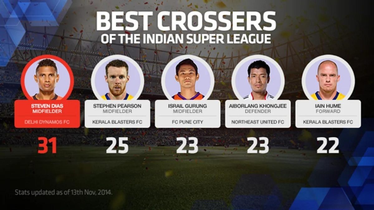Indians may be overshadowed in the ISL by their more illustrious foreign counterparts when it comes to goals, free kicks, shots on target etc, but as far as crossing goes, they are in a league of their own with three Indians in the top five and six in the top 11 with Steven Dias of Delhi Dynamos FC topping the charts. On the other hand, Kerala Blasters, it seems, have the best international crossers in the league thus far. Here the list of the top five crossers in the ISL: