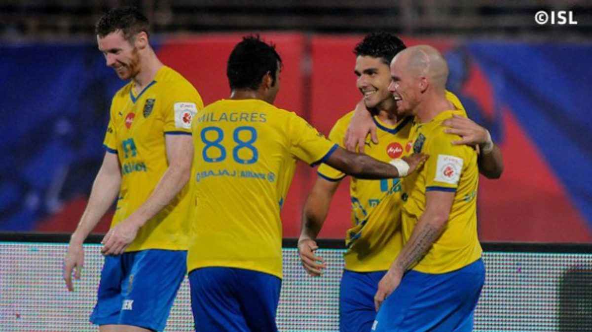 Kerala Blasters FC managed to pull off a hard fought 2-1 win against Atlético de Kolkata at the Jawaharlal Nehru Stadium in Kochi on Friday night. The hosts went two up in the first half through Iain Hume and Pedro Gusmão, while Kolkata’s top scorer Fikru Teferra pulled one back for the visitors in the second session. The match could have ended in a draw, as TV replays showed Luis García’s stoppage time shot had crossed the line after coming off the underside of the crossbar, but was not given by the officials.