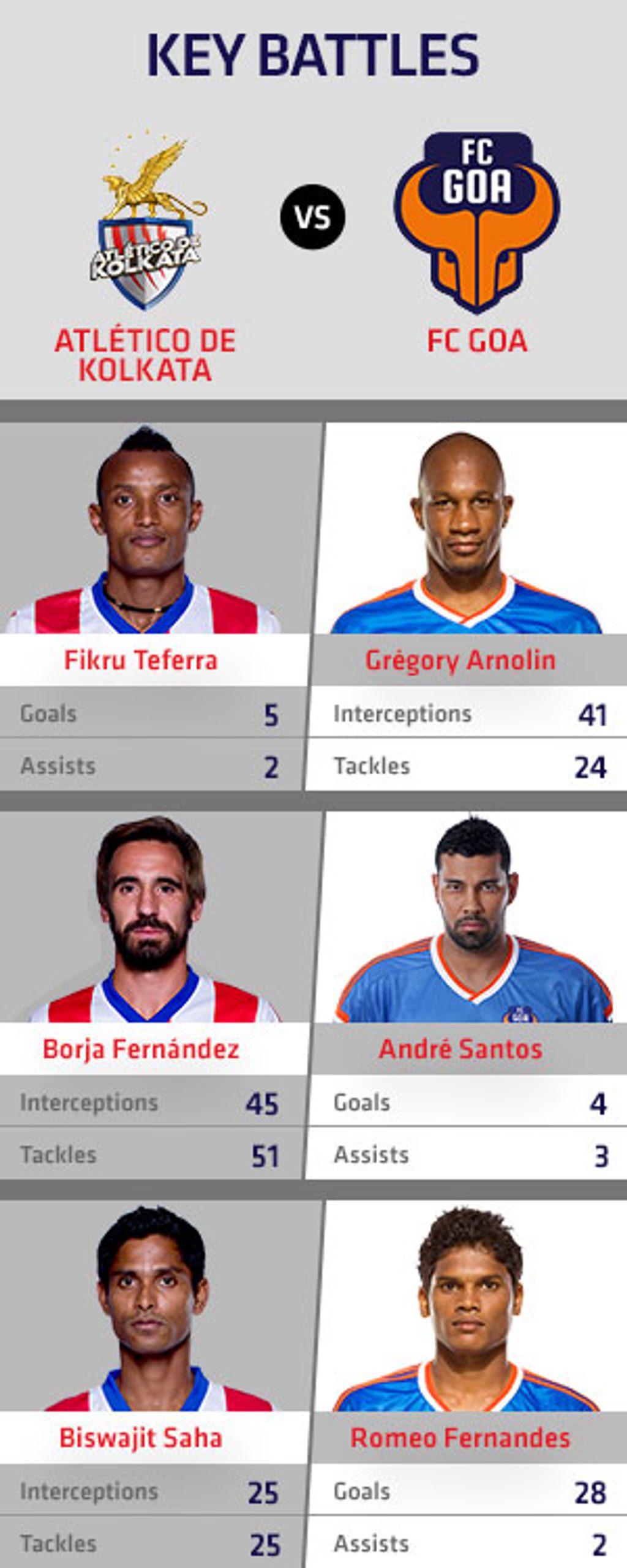 From a defensive point of view, both teams have managed five clean sheets each. Kolkata have made one more interception than Goa (362) and more blocks (96-64) but trail Zico’s men in the tackles category (302-339). The hosts will hope the big occasion inspires them to get their act together so that they can travel to Goa with an advantage.