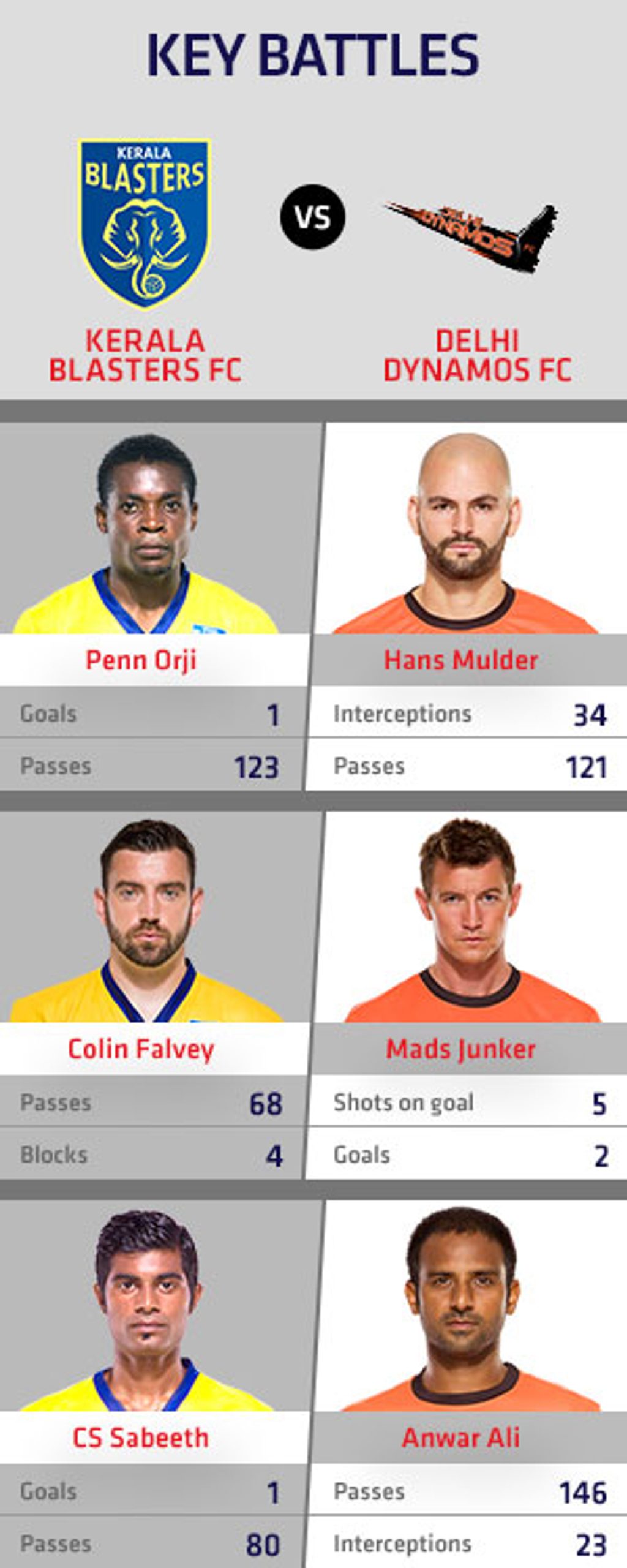 Colin Falvey has started the past three games for Kerala and been part of a defence that has conceded just two goals in three matches. The burly Irishman has formed a good understanding with his defensive partner Cedric Hengbart, and will look to keep Delhi at bay, especially their main striker, Mads Junker, who is a tough man to mark. Junker, with his physicality and pace, is the focal point of the Dynamos attack, and will look to build on his two-goal tally, especially with the support he gets from Del Piero, Shylo and the rest of the Delhi playmakers.