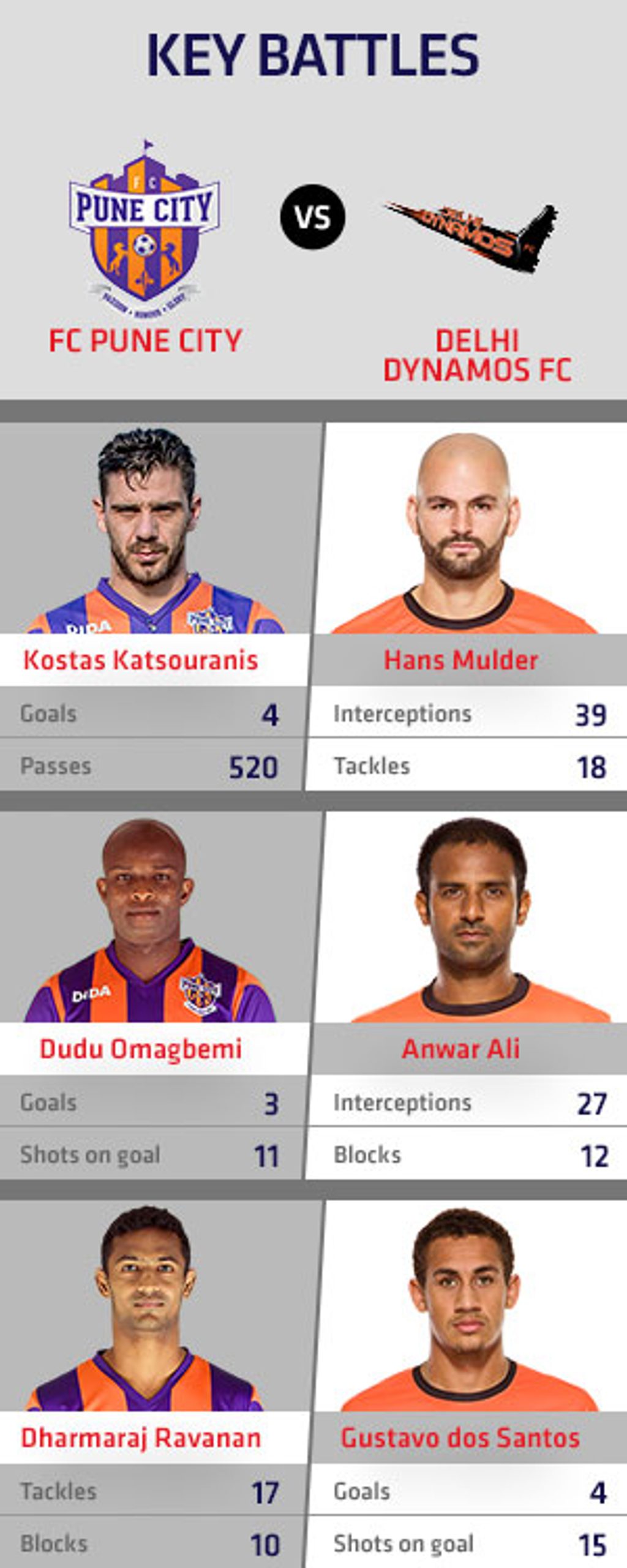 The Greek international Katsouranis has been the most influential midfielder for the hosts with his performances, and has featured in every game for Pune. He provided both the assists for Dudu’s goals against Mumbai, taking his tally to two assists to go along with the four goals he has scored. Dutch midfielder Hans Mulder will be up against him in the middle of the park. Not a player who will be overawed by the task, Mulder has been Delhi’s enforcer in midfield, putting in tackles to break up plays and pressing forward in attack, and chipping in with a couple of handy goals. Kostas might just find going a little difficult against Delhi.